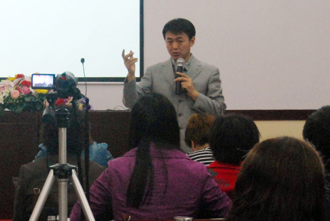 康姿百德副總經(jīng)理包洪吉在研修會上做產(chǎn)品知識講解